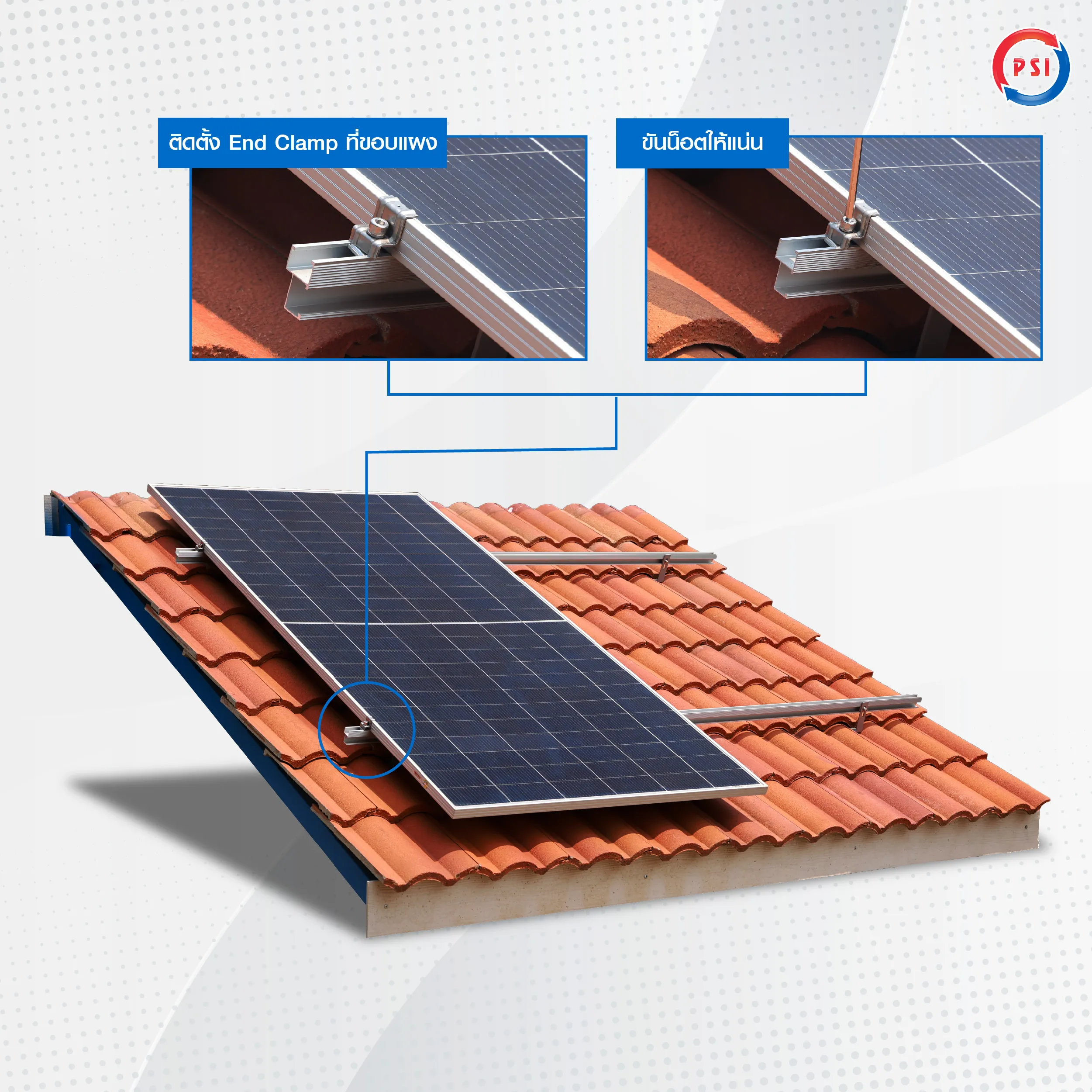 10. ยึดขอบแผงแรกด้วย End Clamp: ติดตั้ง End Clamp ที่ขอบแผงด้านนอก แล้วขันน็อตให้แน่น