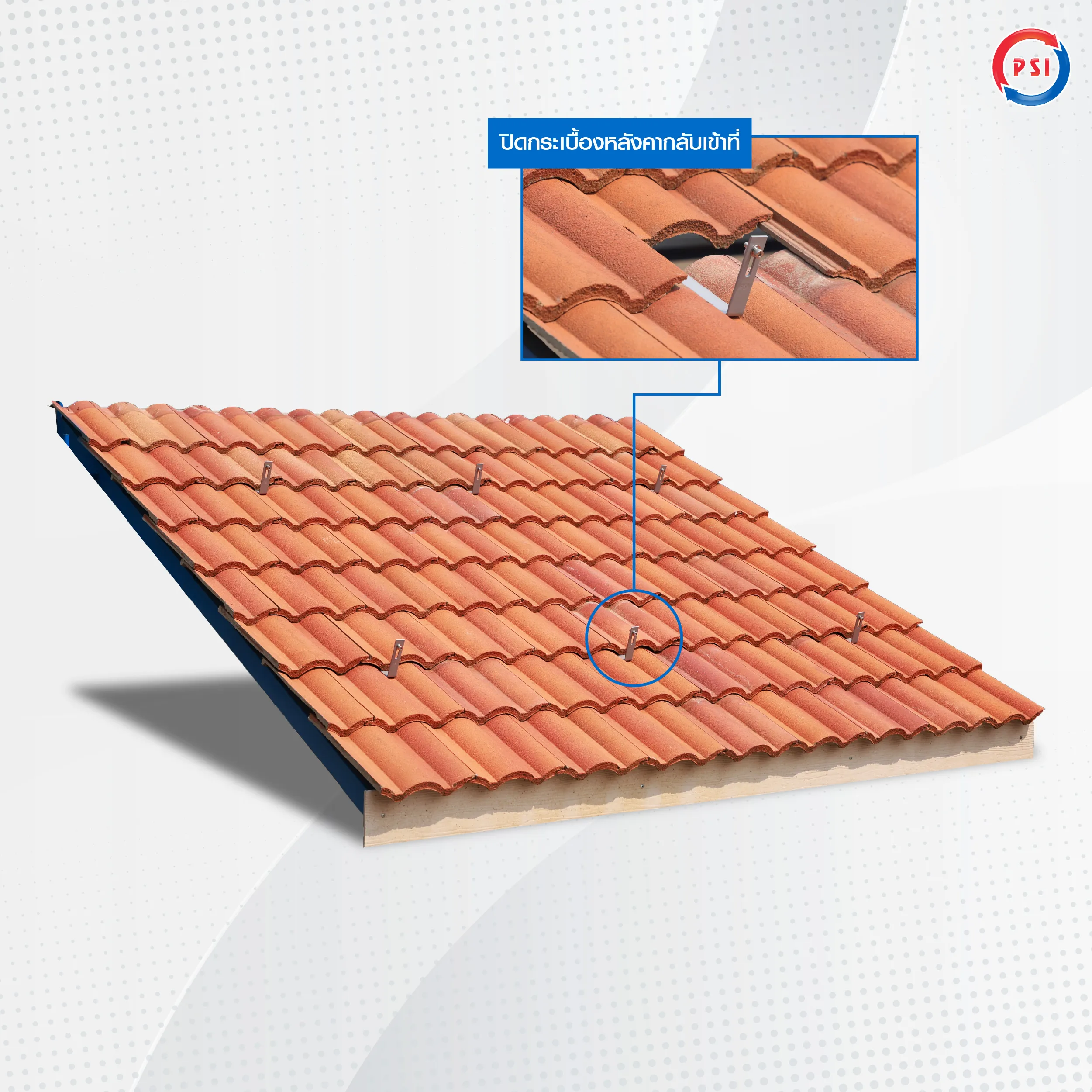 4. ปิดกระเบื้องหลังคากลับเข้าที่: เมื่อติดตั้งขาจับยึดเรียบร้อยแล้ว ให้นำกระเบื้องกลับมาวางในตำแหน่งเดิม
