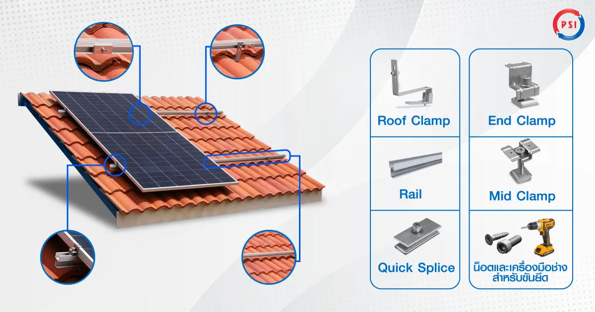 • Roof Clamp: ขาจับยึดที่ตรงตามรุ่นหลังคา (ซีแพค หรือ ซีแพคแผ่นเรียบ)