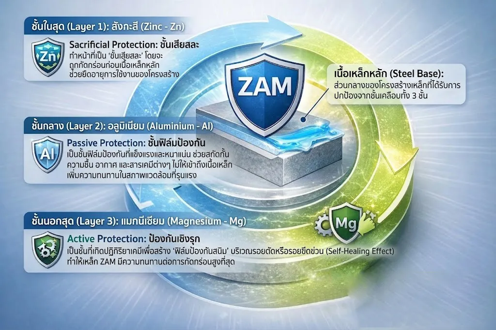 คุณสมบัตินี้เรียกว่า Self-Healing Effect หรือการปกป้องตัวเองของชั้นเคลือบ ซึ่งช่วยลดโอกาสการเกิดสนิมบริเวณขอบหรือรอยตัดของเหล็กได้อย่างมีประสิทธิภาพ ด้วยกลไกเหล่านี้ ทำให้เหล็ก ZAM มีความทนทานต่อการกัดกร่อนสูงกว่าเหล็กชุบสังกะสีทั่วไปหลายเท่า