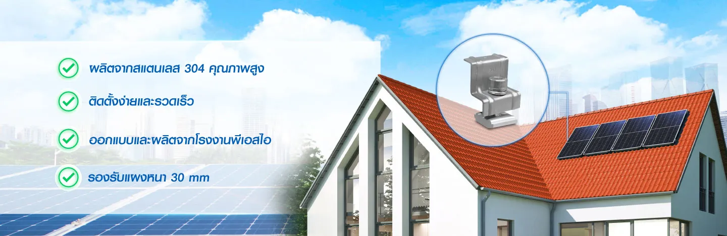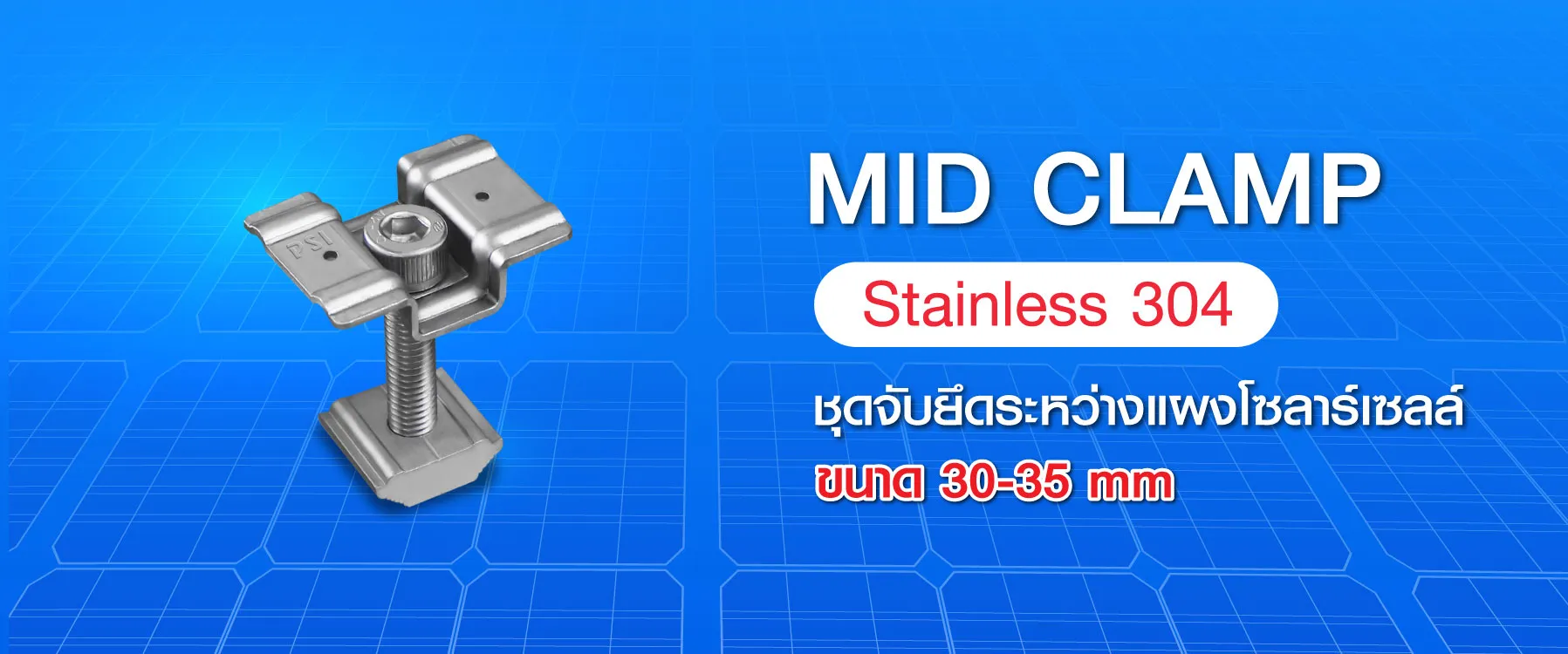 Mid Clamp คือ อุปกรณ์ระหว่างแผงโซลาร์เซลล์ ใช้สำหรับยึดแผงโซลาร์เซลล์ที่อยู่ระหว่างแผง ตั้งแต่แผงที่สองเป็นต้นไป แข็งแรง ทนทาน ไม่เป็นสนิม รองรับขอบแผงหนา 30-35 มม. ช่วยกระจายน้ำหนักแผงได้สมดุล ป้องกันการเลื่อนหรือหลุด ติดตั้งง่าย