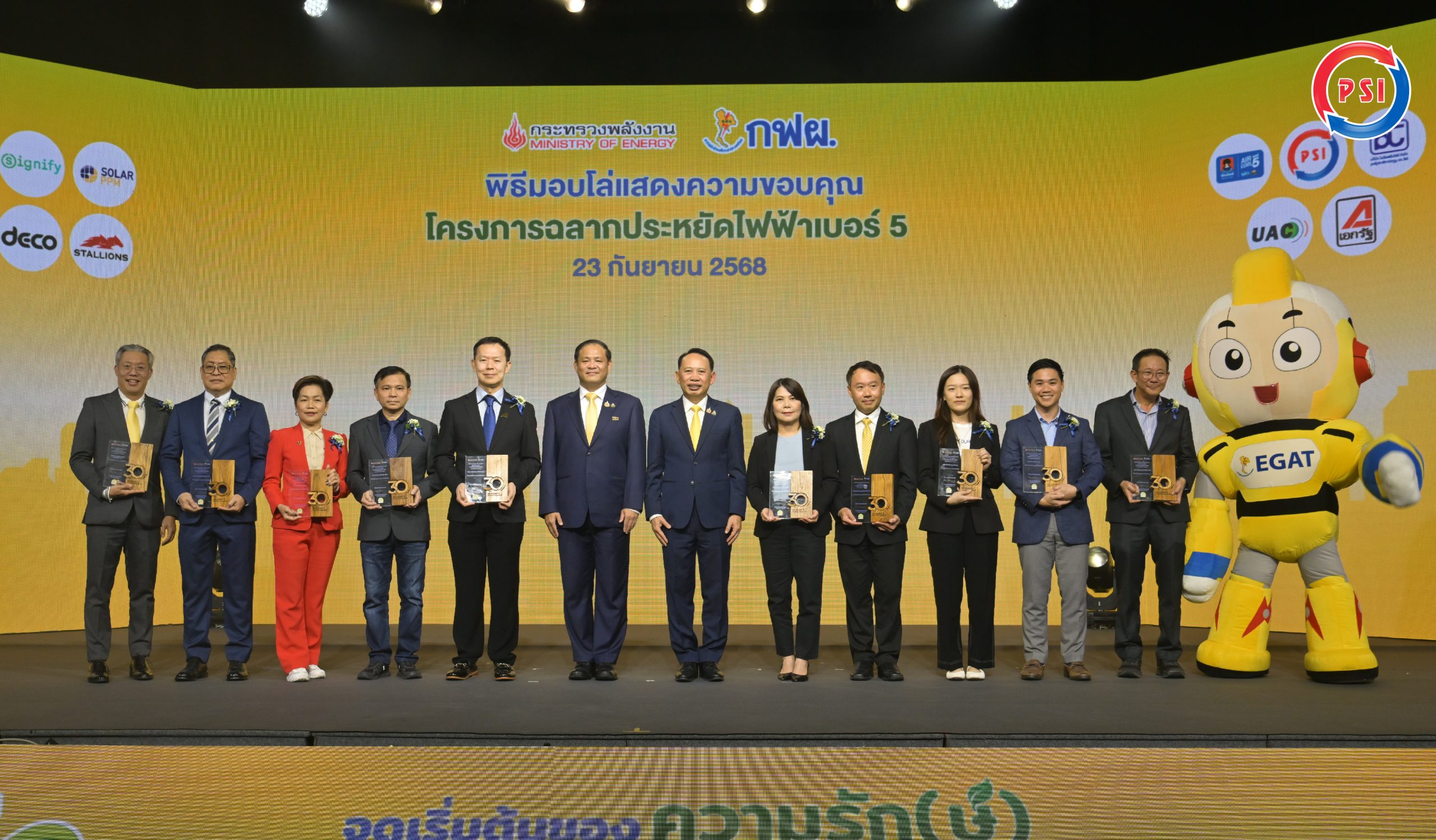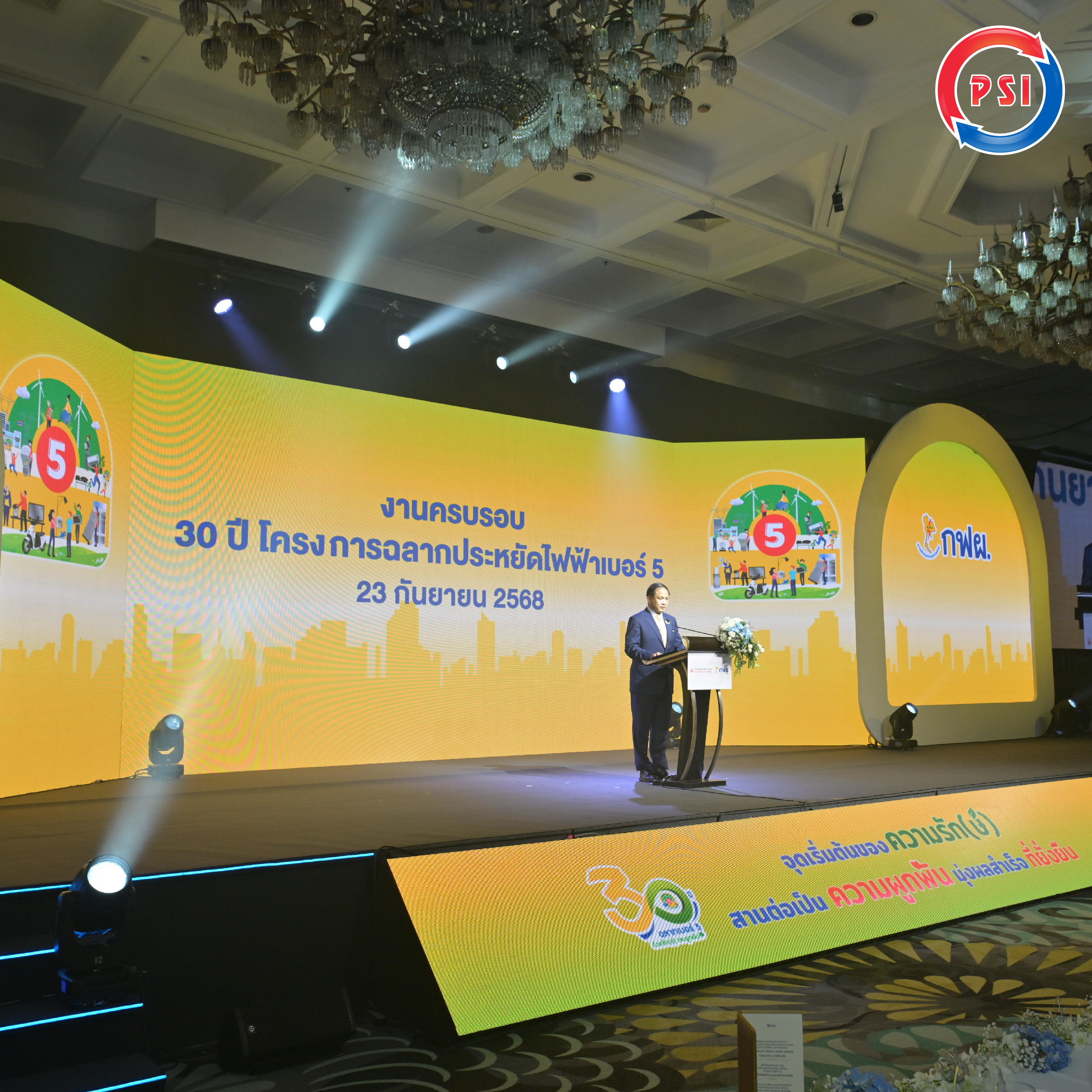 เมื่อวันที่ 23 กันยายน 2568 ณ โรงแรมเซ็นทารา แกรนด์ เซ็นทรัลพลาซา ลาดพร้าว บริษัท PSI ได้รับเกียรติเข้าร่วมงานครบรอบ 30 ปี “โครงการฉลากประหยัดไฟฟ้าเบอร์ 5 ด้วยรัก(ษ์) และผูกพัน” จัดโดยกรมพัฒนาพลังงานทดแทนและอนุรักษ์พลังงาน (พพ.) ร่วมกับการไฟฟ้าฝ่ายผลิตแห่งประเทศไทย (กฟผ.)